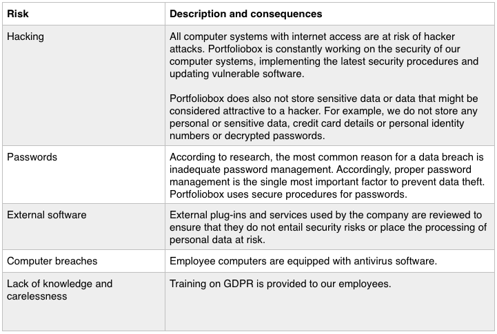 Portfoliobox continuously reviews the risk of storing and processing data. The following risks are considered to be the greatest:
