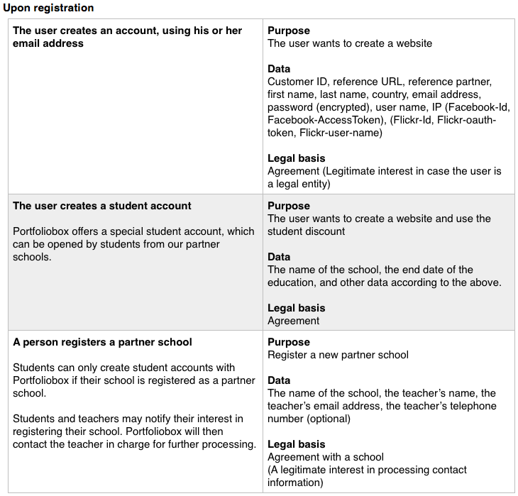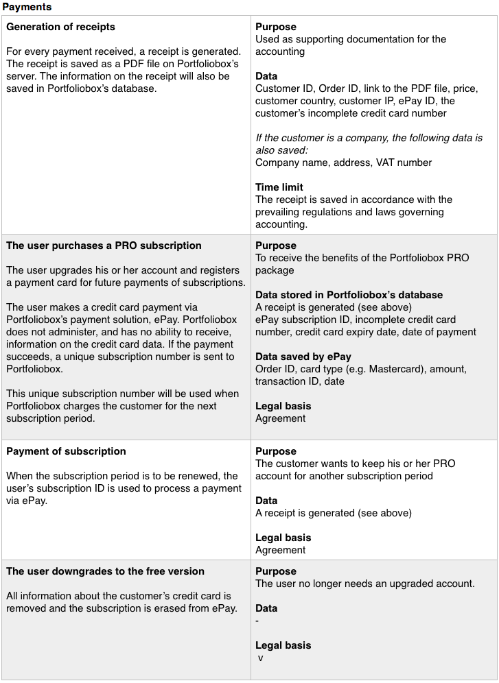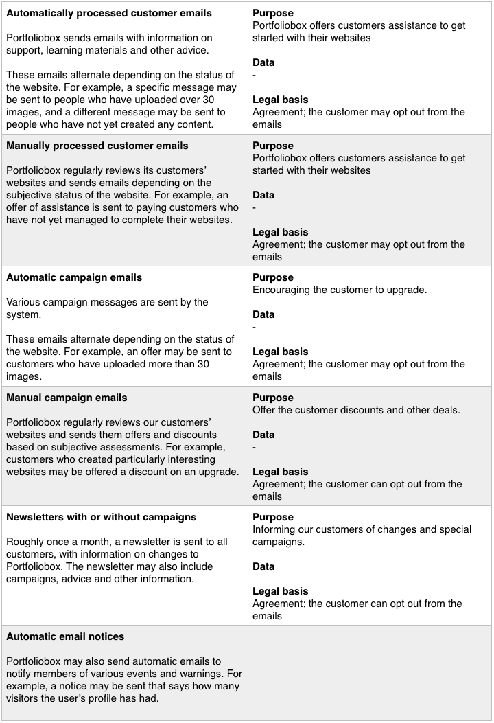 This chapter contains a list of all personal data held by Portfoliobox and the processing of such personal data.