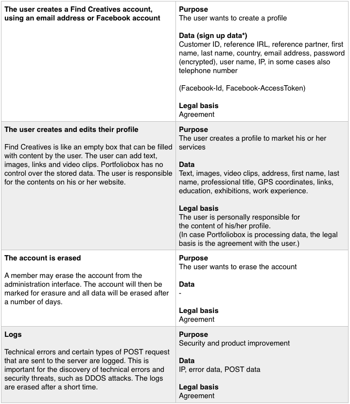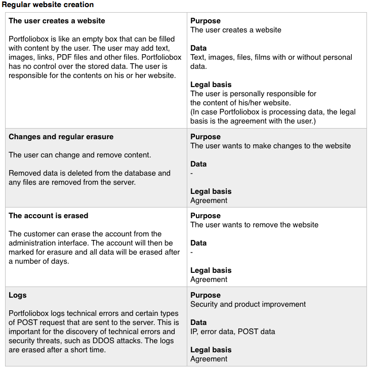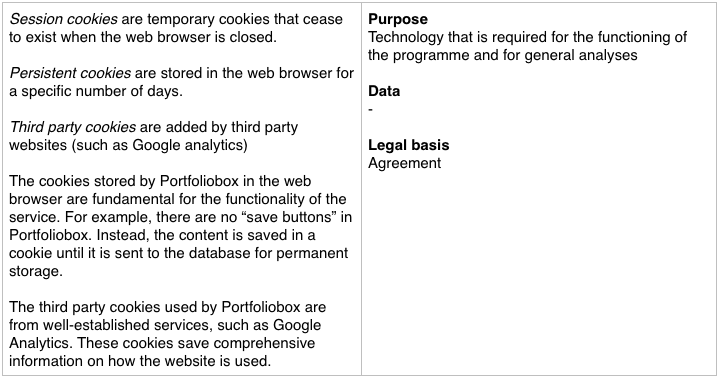 When the user creates an account, the person accepts that Portfoliobox stores and processes personal data according to the information stated below.