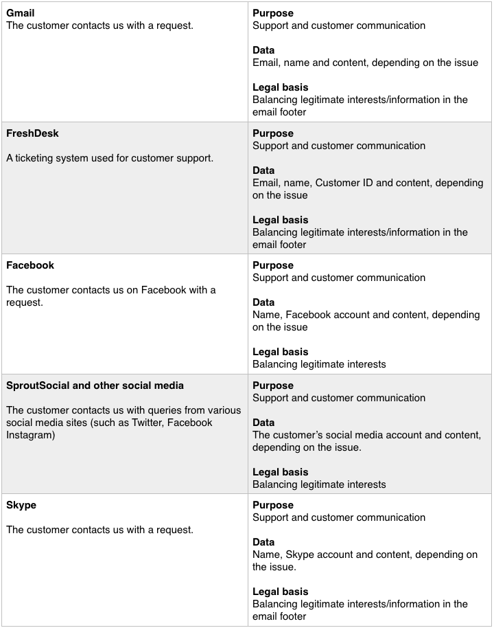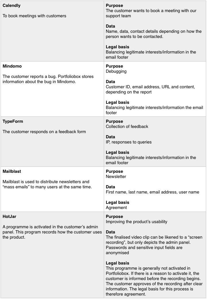 Portfoliobox offers support, customer care and debugging. This work is processed in several different systems. Stored data and the processing of data varies between systems, see the table below. All systems are online-based “cloud services”.